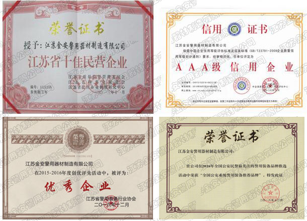 第一批新型單警裝備定點生產企業 公安部警用裝備采購中心協議供貨單位 公安部防彈防刺服生產定點企業 江蘇省公安廳防彈衣入圍企業 江蘇警用裝備行業協會會員單位 中國刑事科學技術協會團隊會員單位 中國安全防范產品行業協會會員單位 靖江市保安器材行業協會常務理事單位 全國警用裝備標準化技術委員會通訊委員 江蘇金安警用器材制造有限公司始創于九十年代初,公安部防彈防刺服生產定點企業、公安部警用裝備采購中心2..